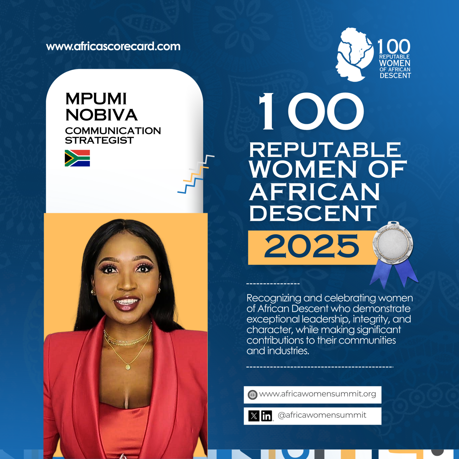 Mpumi Nobiva’s story is a shining example of how education, resilience, and strategic communication can be harnessed to create lasting impact. Her advocacy work continues to empower individuals, shape influential conversations, and uplift communities. By turning personal adversity into a platform for change, she exemplifies the power of storytelling as a tool for social progress, making her a distinguished figure among the 100 Reputable Women of African Descent 2025.