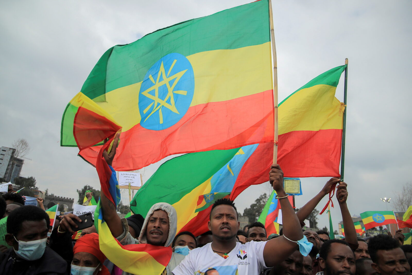 FILE PHOTO: People wave their flags as they attend a pro-government rally to celebrate the second filling of the Great Renaissance Dam (GERD) and condemn the Tigray People Liberation Front (TPLF) at Meskel Square in Addis Ababa, Ethiopia, July 22, 2021. REUTERS/Tiksa Negeri/File Photo